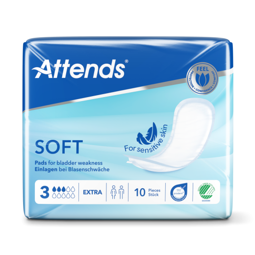 Az új Attends Soft kisbetétek többféle nedvszívó fokozatban kaphatók (1-tól 3-as fokozatig), melyek védelmet biztosítanak a könnyű vizeletinkontinenciával rendelkezők számára.