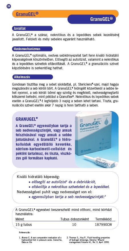 A GranuGEL® optimális, nedves sebkörnyezetet tart fenn kiváló hidratáló képességének köszönhetően. Elősegíti az autolízist, valamint a nekrotikus és a lepedékes szövetek eltávolítását. A GranuGEL® a granulációs szövetképződésére is serkentőleg hathat.