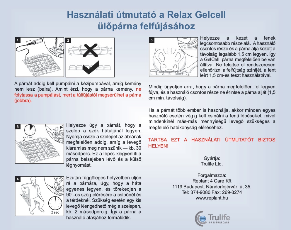 A termékhez huzatot, pumpát és javító készletet biztosítunk. A huzat a párna védelmére szolgál, vízálló, tisztítható, valamint gomba- és baktériumölő tulajdonsággal rendelkezik. A pumpa az ülőpárna felfújására alkalmas. A javító készlet csak ideiglenes javításra használható.